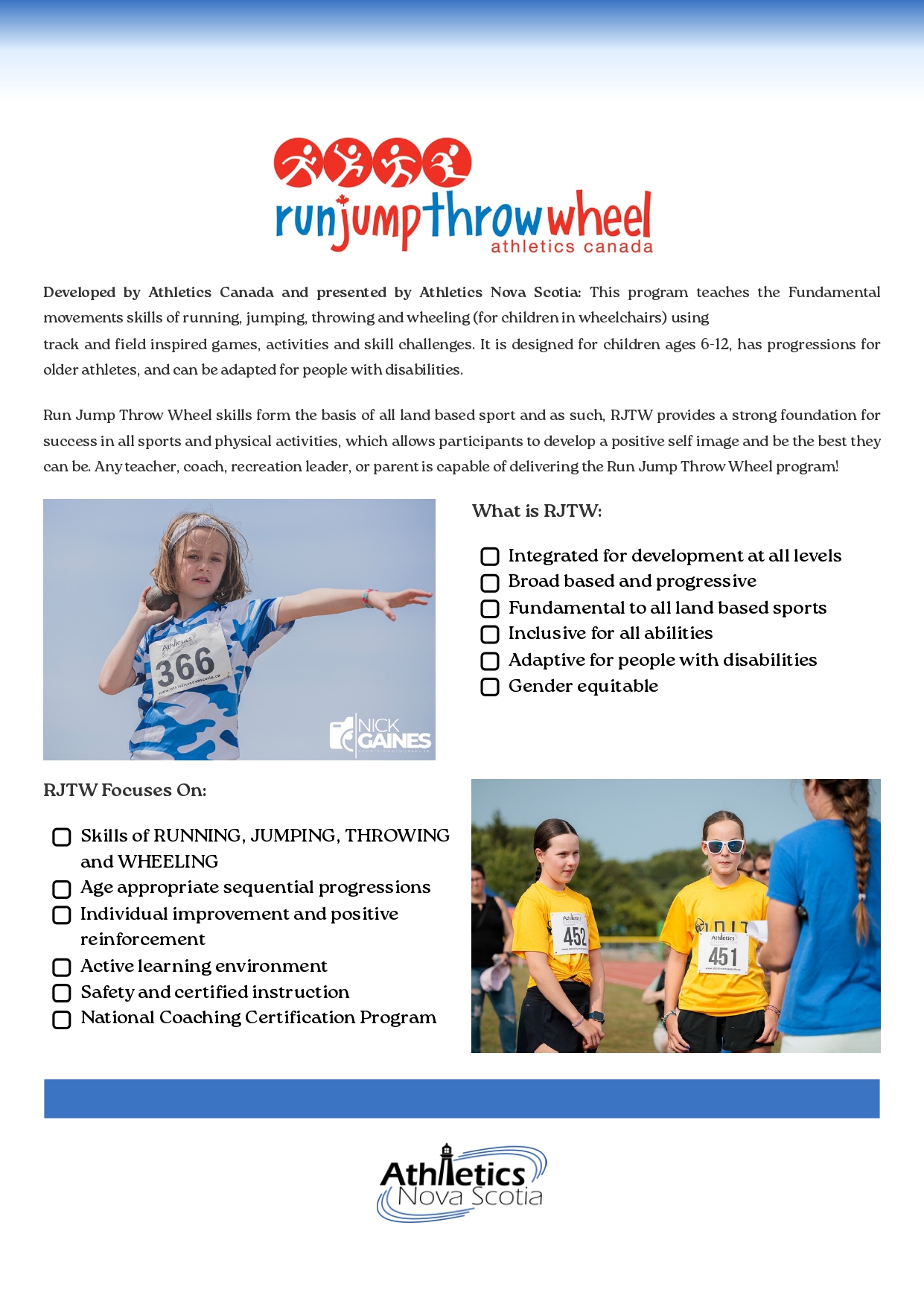 Run Jump Throw Wheel (RJTW) is a national program developed by Athletics Canada that teaches fundamental movement skills and develops physical literacy. Using track and field inspired games, activities and skill challenges lead by instructors specifically trained to teach the fundamentals of running, jumping, throwing and wheeling (for children in wheelchairs).